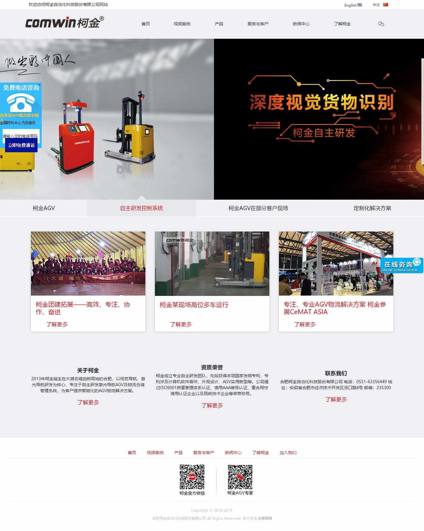 2013年柯金诞生在大湖名城创新高地的合肥。以视觉导航、激光导航研发为核心,专注于自主研发激光导航AGV及物流仓储管理系统,为客户提供智能化的AGV物流解决方案。合肥柯金自动化科技股份有限公司作为一家高科技企业,经过短短几年的发展,柯金所取得的进步和成就是有目共睹的,生产出数十种性能稳定,功能优越的AGV产品。服务遍及汽车、新能源、军工、医药、冷链、电商、电力、建材等众多行业领域。与东风日产、西门子、SICK、Teksid、MINTH、京东、中航工业、国家电网、中国恒天、中国建材、中国武警等国内外知名企业建立长期合作,完成百余项工程案例。